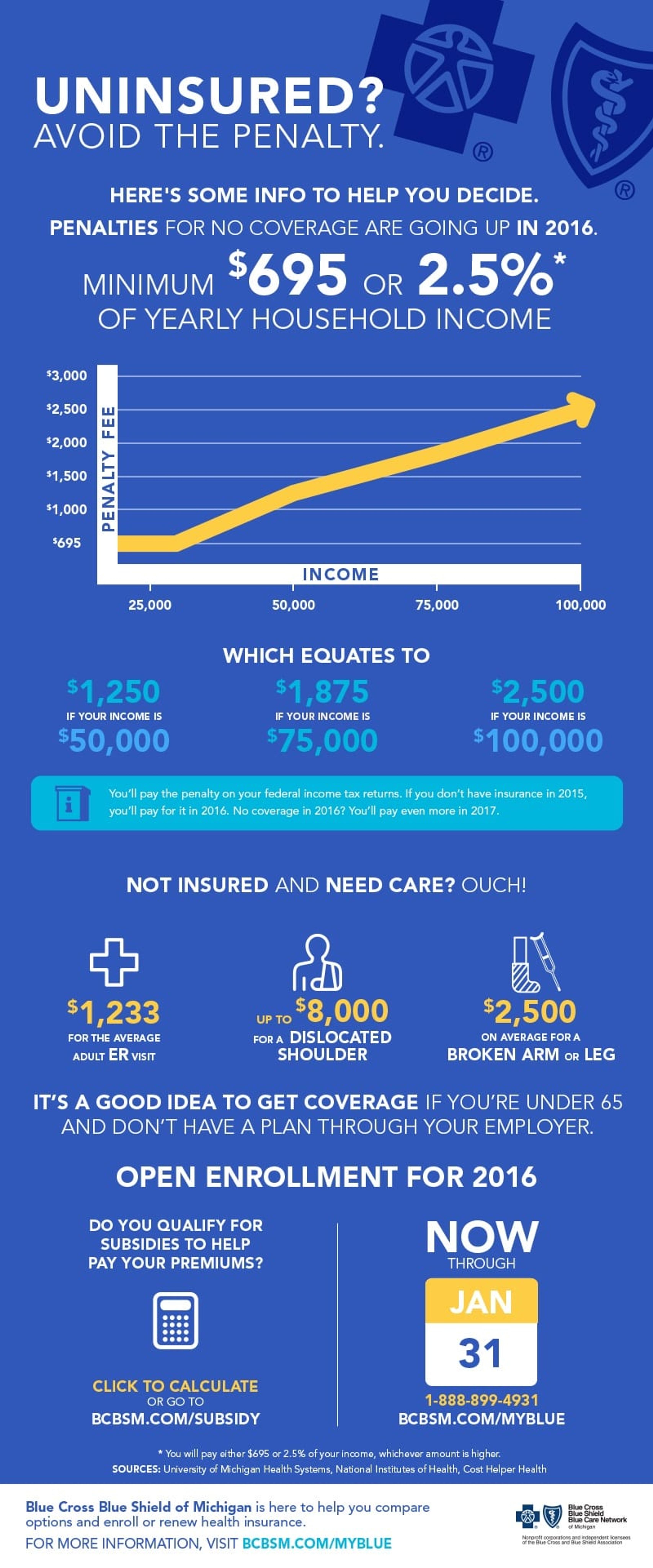 By law, you need to have health insurance. If you choose not to buy health insurance, you must pay a fee called the individual shared responsibility payment. This government regulated fee is calculated as either 2.5 percent of your household income or $695 per adult and $347.50 per child (you pay whichever of the two options is higher) and covers the duration of time you went without coverage. In 2014, over 7 million US households paid over $1.5 billion in penalties. The fee isn’t the only expense you might be faced with if you don’t have health insurance. If you’re uninsured and an accident or illness occurs, you could be stuck with a large medical bill to be covered out of pocket. Health care insurance provides coverage and security for your wellbeing and pocketbook. With open enrollment underway, now is the time to take advantage of the affordable health care options offered through Blue Cross Blue Shield of Michigan and avoid costly fees and penalties. Worried about the cost of having health insurance? There are plans at every budget level, so you can choose the one that works best for you. You can also use this subsidy estimator to find out if you are eligible for financial assistance, which will help lower the cost of your health plan even more. Here's a little more about how going uninsured can impact your bank account: